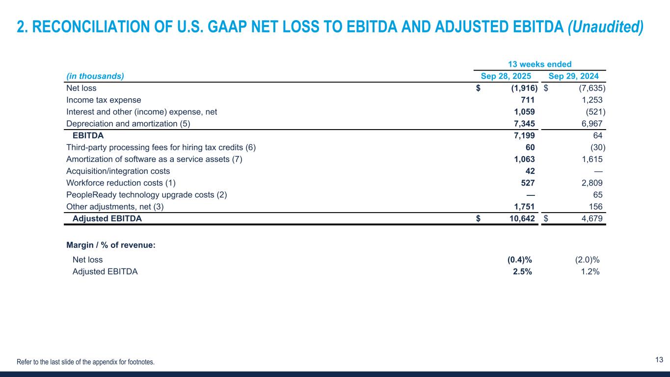 13 2. RECONCILIATION OF U.S. GAAP NET LOSS TO EBITDA AND ADJUSTED EBITDA (Unaudited) Refer to the last slide of the appendix for footnotes. 13 weeks ended (in thousands) Sep 28, 2025 Sep 29, 2024 Net loss $ (1,916) $ (7,635) Income tax expense 711 1,253 Interest and other (income) expense, net 1,059 (521) Depreciation and amortization (5) 7,345 6,967 EBITDA 7,199 64 Third-party processing fees for hiring tax credits (6) 60 (30) Amortization of software as a service assets (7) 1,063 1,615 Acquisition/integration costs 42 — Workforce reduction costs (1) 527 2,809 PeopleReady technology upgrade costs (2) — 65 Other adjustments, net (3) 1,751 156 Adjusted EBITDA $ 10,642 $ 4,679 Margin / % of revenue: Net loss (0.4) % (2.0) % Adjusted EBITDA 2.5 % 1.2 %