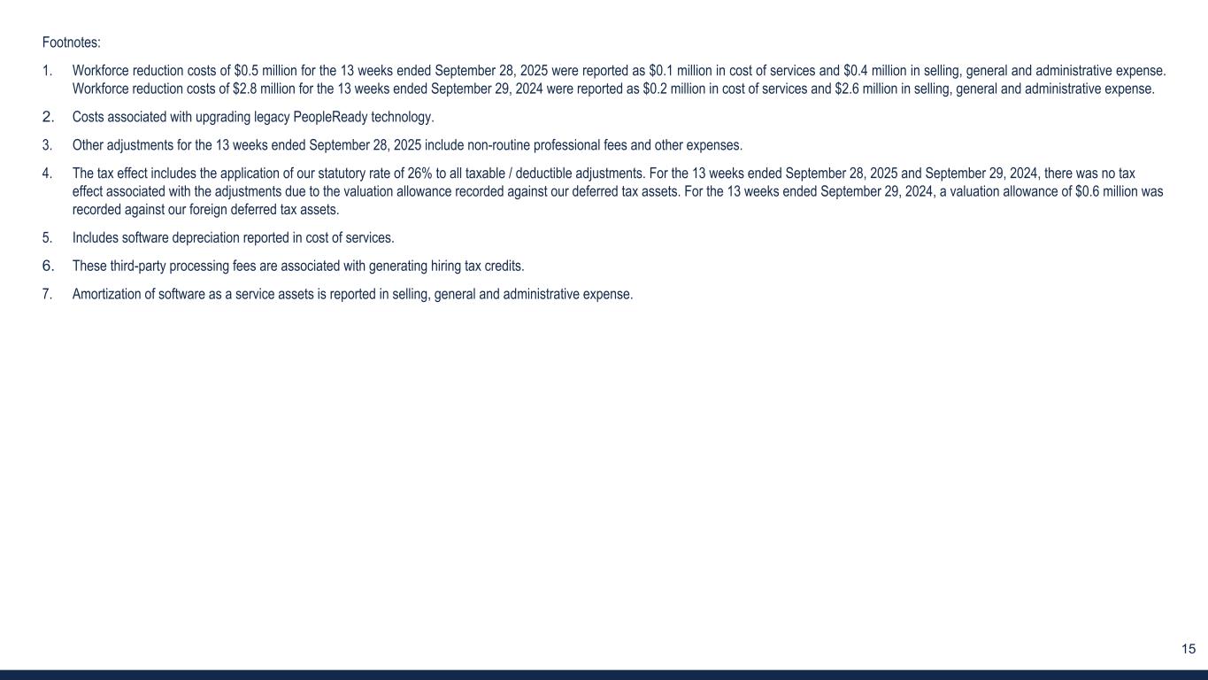 14 3. RECONCILIATION OF U.S. GAAP SELLING, GENERAL AND ADMINISTRATIVE EXPENSE TO ADJUSTED SG&A EXPENSE (Unaudited) Refer to the last slide of the appendix for footnotes. 13 weeks ended (in thousands) Sep 28, 2025 Sep 29, 2024 Selling, general and administrative expense $ 91,728 $ 99,973 Third-party processing fees for hiring tax credits (6) (60) 30 Amortization of software as a service assets (7) (1,063) (1,615) Acquisition/integration costs (42) — Workforce reduction costs (1) (374) (2,601) PeopleReady technology upgrade costs (2) — (65) Other adjustments, net (3) (1,751) (156) Adjusted SG&A expense $ 88,438 $ 95,566 % of revenue: Selling, general and administrative expense 21.3 % 26.1 % Adjusted SG&A expense 20.5 % 25.0 %
