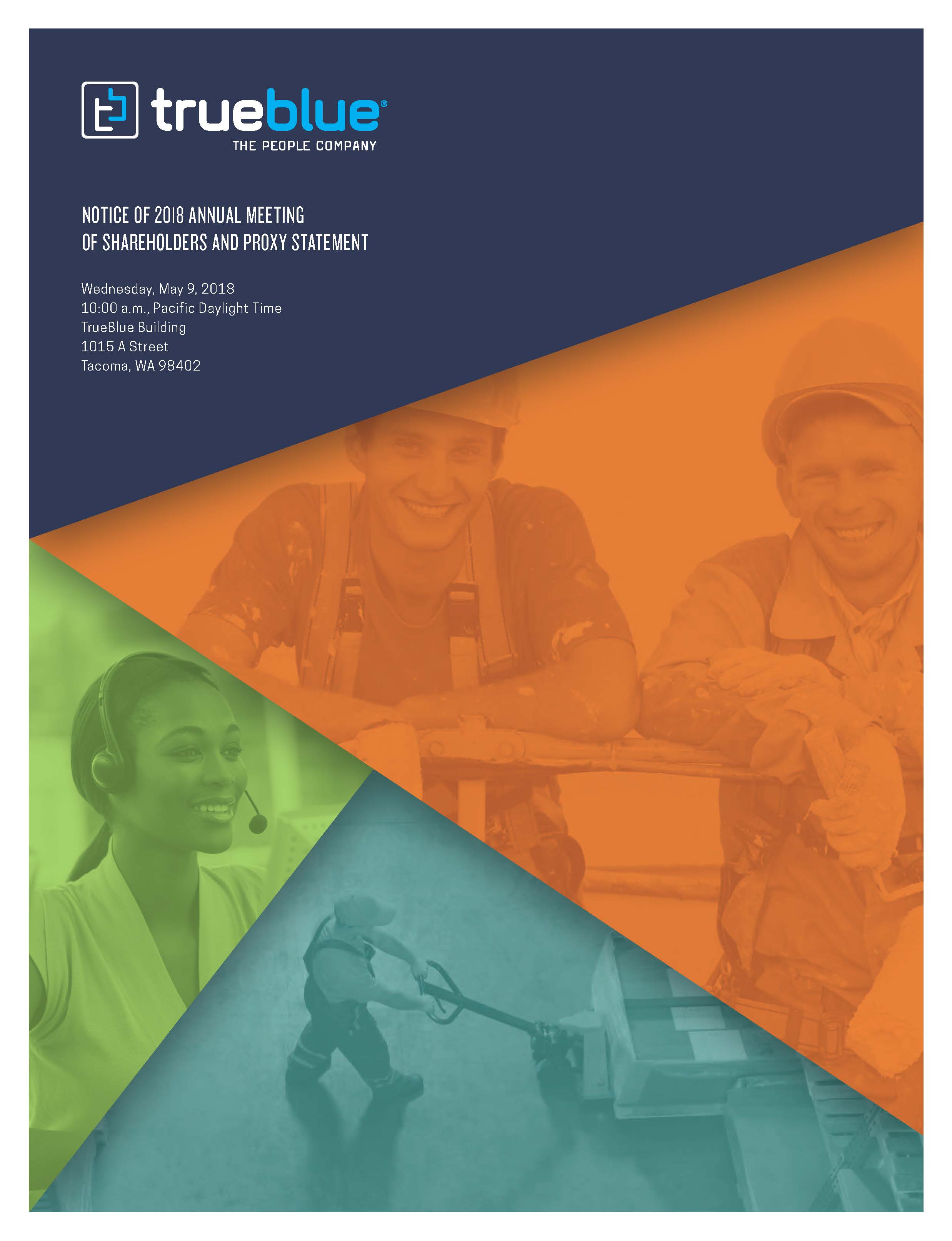 On behalf of the board of directors and management of TrueBlue, Inc. (“TrueBlue”), it is a pleasure to invite you to TrueBlue’s 2018 Annual Meeting of Shareholders, to be held at TrueBlue’s corporate headquarters located at 1015 A Street, Tacoma, Washington 98402, on Wednesday, May 9, 2018, at 10:00 a.m., Pacific Daylight Time.