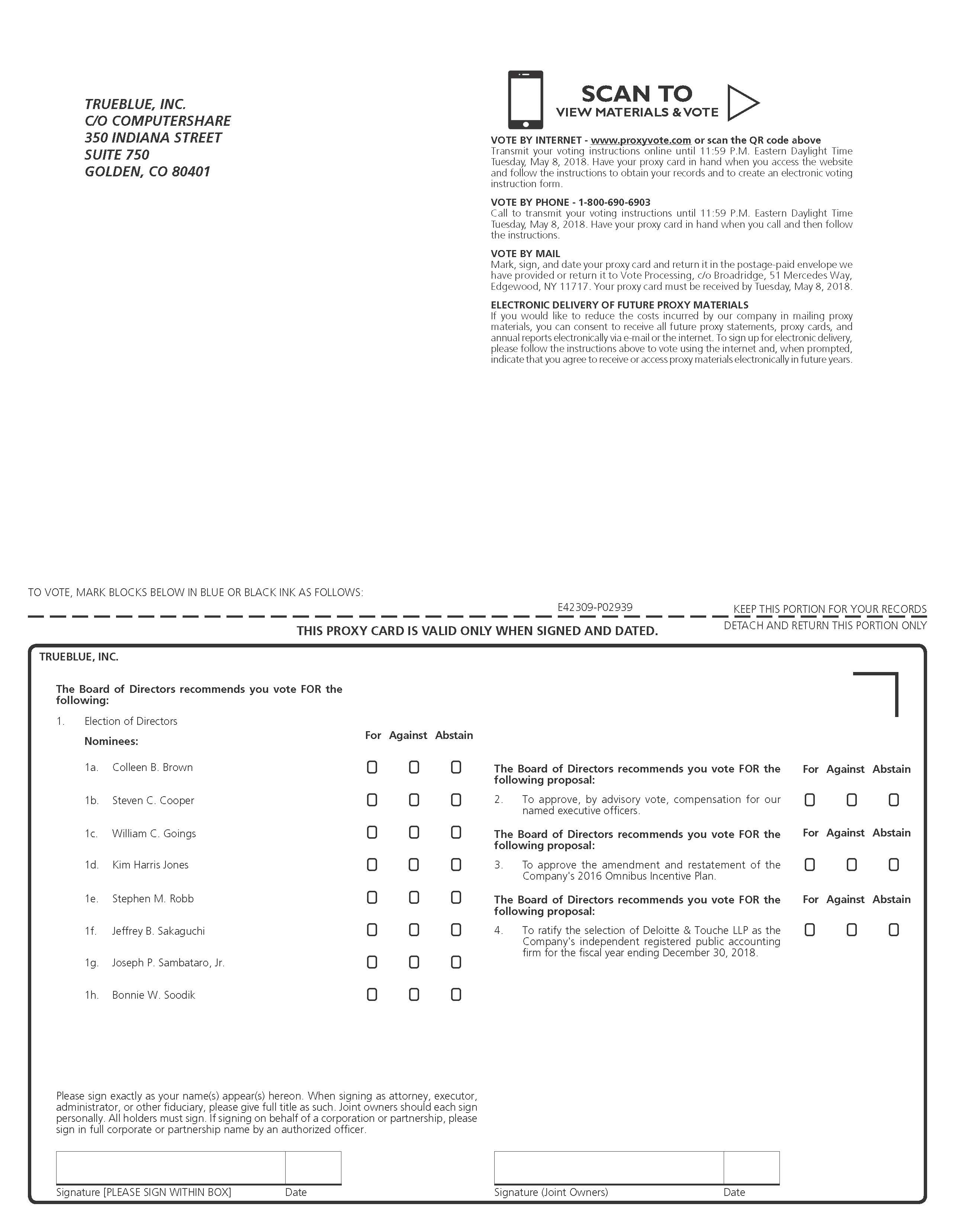 TRUEBLUE, INC. C/O COMPUTERSHARE 350 INDIANA STREET SUITE 750 GOLDEN, CO 80401 SCAN TO VIEW MATERIALS & VOTE VOTE BY INTERNET - www.proxyvote.com or scan the QR code above Transmit your voting instructions online until 11:59 P.M. Eastern Daylight Time Tuesday, May 8, 2018. Have your proxy card in hand when you access the website and follow the instructions to obtain your records and to create an electronic voting instruction form. VOTE BY PHONE - 1-800-690-6903 Call to transmit your voting instructions until 11:59 P.M. Eastern Daylight Time Tuesday, May 8, 2018. Have your proxy card in hand when you call and then follow the instructions. VOTE BY MAIL Mark, sign, and date your proxy card and return it in the postage-paid envelope we have provided or return it to Vote Processing, c/o Broadridge, 51 Mercedes Way, Edgewood, NY 11717. Your proxy card must be received by Tuesday, May 8, 2018. ELECTRONIC DELIVERY OF FUTURE PROXY MATERIALS If you would like to reduce the costs incurred by our company in mailing proxy materials, you can consent to receive all future proxy statements, proxy cards, and annual reports electronically via e-mail or the internet. To sign up for electronic delivery, please follow the instructions above to vote using the internet and, when prompted, indicate that you agree to receive or access proxy materials electronically in future years. TO VOTE, MARK BLOCKS BELOW IN BLUE OR BLACK INK AS FOLLOWS: E42309-P02939 KEEP THIS PORTION FOR YOUR RECORDS DETACH AND RETURN THIS PORTION ONLY THIS PROXY CARD IS VALID ONLY WHEN SIGNED AND DATED. TRUEBLUE, INC. The Board of Directors recommends you vote FOR the following: 1. Election of Directors Nominees: For Against Abstain 1a. Colleen B. Brown 1e. Stephen M. Robb 1d. Kim Harris Jones 1b. Steven C. Cooper 1c. William C. Goings 1h. Bonnie W. Soodik 1f. Jeffrey B. Sakaguchi 1g. Joseph P. Sambataro, Jr. The Board of Directors recommends you vote FOR the following proposal: For Against Abstain 2. To approve, by advisory vote, compensation for our named executive officers. The Board of Directors recommends you vote FOR the following proposal: 3. To approve the amendment and restatement of the Company's 2016 Omnibus Incentive Plan. The Board of Directors recommends you vote FOR the following proposal: 4. To ratify the selection of Deloitte & Touche LLP as the Company's independent registered public accounting firm for the fiscal year ending December 30, 2018. Please sign exactly as your name(s) appear(s) hereon. When signing as attorney, executor, administrator, or other fiduciary, please give full title as such. Joint owners should each sign personally. All holders must sign. If signing on behalf of a corporation or partnership, please sign in full corporate or partnership name by an authorized officer. Signature [PLEASE SIGN WITHIN BOX] Date Signature (Joint Owners) Date