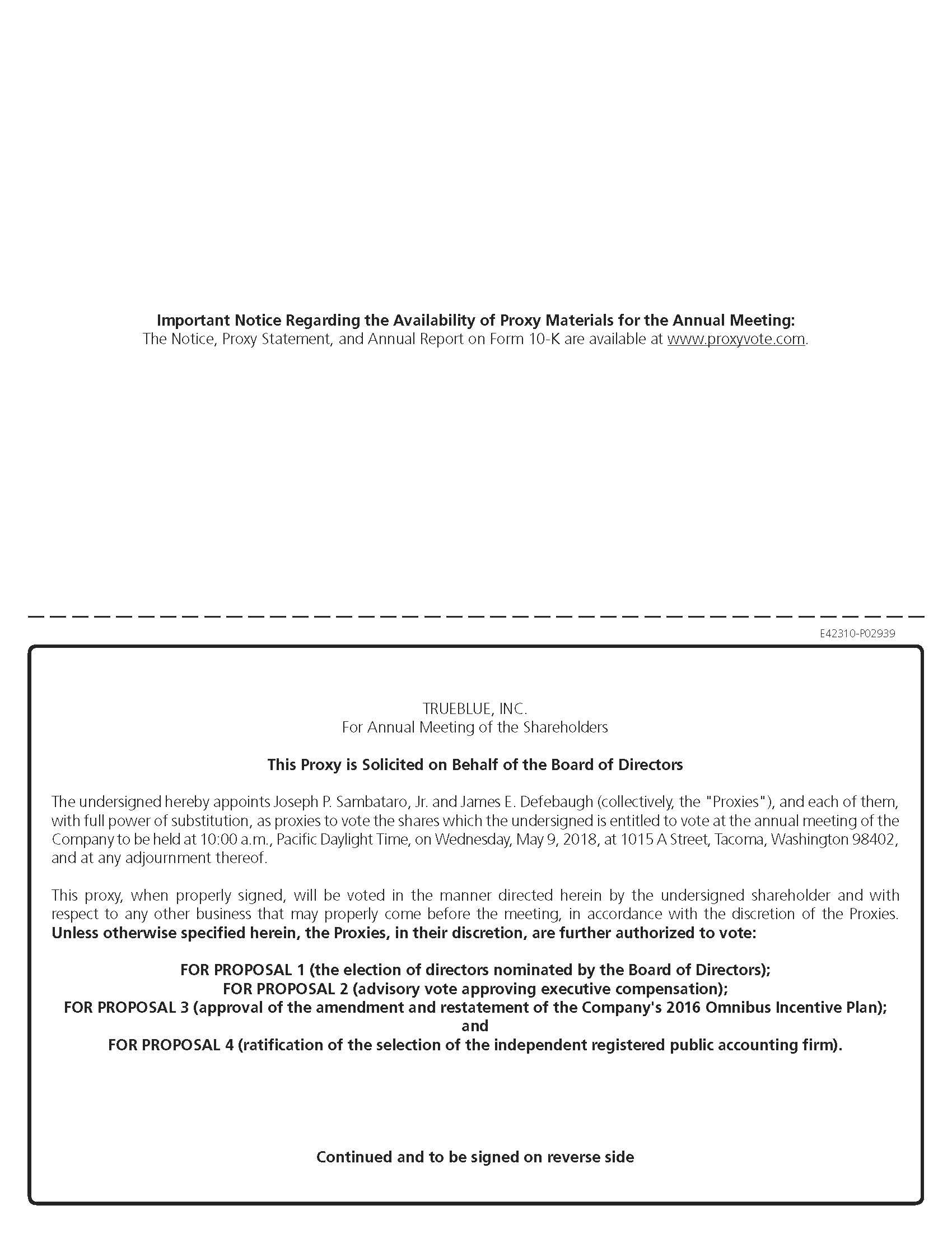 Important Notice Regarding the Availability of Proxy Materials for the Annual Meeting: The Notice, Proxy Statement, and Annual Report on Form 10-K are available at www.proxyvote.com. E42310-P02939 TRUEBLUE, INC. For Annual Meeting of the Shareholders This Proxy is Solicited on Behalf of the Board of Directors The undersigned hereby appoints Joseph P. Sambataro, Jr. and James E. Defebaugh (collectively, the "Proxies"), and each of them, with full power of substitution, as proxies to vote the shares which the undersigned is entitled to vote at the annual meeting of the Company to be held at 10:00 a.m., Pacific Daylight Time, on Wednesday, May 9, 2018, at 1015 A Street, Tacoma, Washington 98402, and at any adjournment thereof. This proxy, when properly signed, will be voted in the manner directed herein by the undersigned shareholder and with respect to any other business that may properly come before the meeting, in accordance with the discretion of the Proxies. Unless otherwise specified herein, the Proxies, in their discretion, are further authorized to vote: FOR PROPOSAL 1 (the election of directors nominated by the Board of Directors); FOR PROPOSAL 2 (advisory vote approving executive compensation); FOR PROPOSAL 3 (approval of the amendment and restatement of the Company's 2016 Omnibus Incentive Plan); and FOR PROPOSAL 4 (ratification of the selection of the independent registered public accounting firm). Continued and to be signed on reverse side
