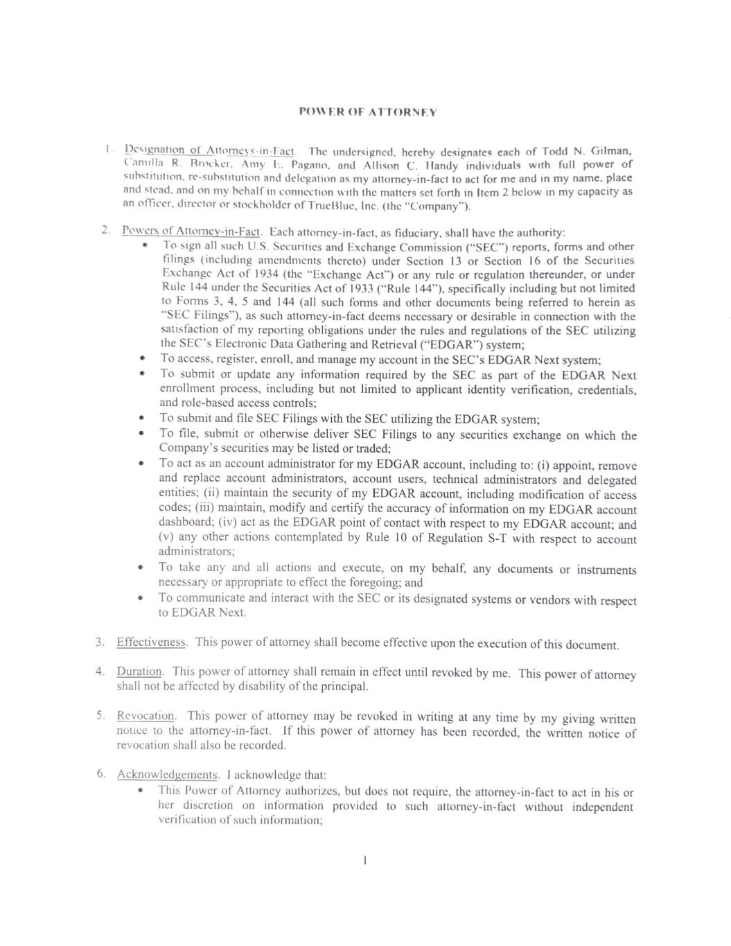 POWER OF ATTORNEY 1. Designation of Attorneys-in-Fact. The undersigned, hereby designates each of Todd N. Gilman, Camilla R. Brocker, Amy E. Pagano, and Allison C. Handy individuals with full power of substitution, re-substitution and delegation as my attorney-in-fact to act for me and in my name, place and stead, and on my behalf in connection with the matters set forth in Item 2 below in my capacity as an officer, director or stockholder of TrueBlue, Inc. (the "Company"). 2. Powers of Attorney-in-Fact. Each attorney-in-fact, as fiduciary, shall have the authority: To sign all such U.S. Securities and Exchange Commission ("SEC") reports, forms and other filings (including amendments thereto) under Section 13 or Section 16 of the Securities Exchange Act of 1934 (the "Exchange Act") or any rule or regulation thereunder, or under Rule 144 under the Securities Act of 1933 ("Rule 144"), specifically including but not limited to Forms 3, 4, 5 and 144 (all such forms and other documents being referred to herein as "SEC Filings"), as such attorney-in-fact deems necessary or desirable in connection with the satisfaction of my reporting obligations under the rules and regulations of the SEC utilizing the SEC's Electronic Data Gathering and Retrieval ("EDGAR") system; ? To access, register, enroll, and manage my account in the SEC's EDGAR Next system; ? To submit or update any information required by the SEC as part of the EDGAR Next enrollment process, including but not limited to applicant identity verification, credentials, and role-based access controls; ? To submit and file SEC Filings with the SEC utilizing the EDGAR system; ? To file, submit or otherwise deliver SEC Filings to any securities exchange on which the Company's securities may be listed or traded; ? To act as an account administrator for my EDGAR account, including to: (i) appoint, remove and replace account administrators, account users, technical administrators and delegated entities; (ii) maintain the security of my EDGAR account, including modification of access codes; (iii) maintain, modify and certify the accuracy of information on my EDGAR account dashboard; (iv) act as the EDGAR point of contact with respect to my EDGAR account; and (v) any other actions contemplated by Rule 10 of Regulation S-T with respect to account administrators; ? To take any and all actions and execute, on my behalf, any documents or instruments necessary or appropriate to effect the foregoing; and ? To communicate and interact with the SEC or its designated systems or vendors with respect to EDGAR Next. 3. Effectiveness. This power of attorney shall become effective upon the execution of this document. 4. Duration. This power of attorney shall remain in effect until revoked by me. This power of attorney shall not be affected by disability of the principal. 5. Revocation. This power of attorney may be revoked in writing at any time by my giving written notice to the attorney-in-fact. If this power of attorney has been recorded, the written notice of revocation shall also be recorded. 6. Acknowledgements. I acknowledge that: This Power of Attorney authorizes, but does not require, the attorney-in-fact to act in his or her discretion on information provided to such attorney-in-fact without independent verification of such information;