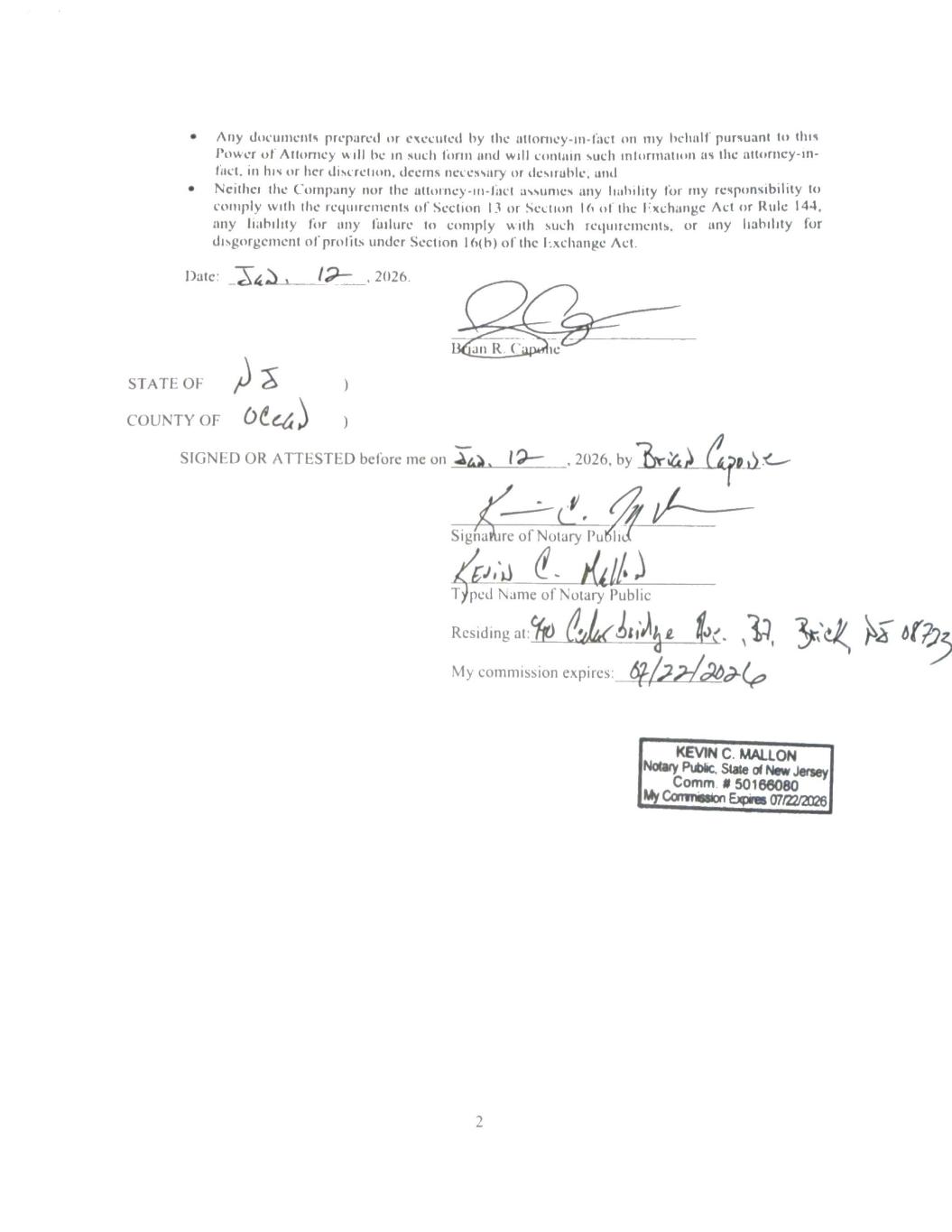 ? Any documents prepared or executed by the attorney-in-fact on my behalf pursuant to this Power of Attorney will be in such form and will contain such information as the attorney-in- fact, in his or her discretion, deems necessary or desirable; and ? Neither the Company nor the attorney-in-fact assumes any liability for my responsibility to comply with the requirements of Section 13 or Section 16 of the Exchange Act or Rule 144, any liability for any failure to comply with such requirements, or any liability for disgorgement of profits under Section 16(b) of the Exchange Act. Date: J a n . - 2026. Bean R. Capehe STATE OF COUNTY OF OCca) SIGNED OR ATTESTED before me on Jai. 12 , 2026, by Briad Capede Signature of Notary Publid KEviN C. Ma l l ) Typed Name of Notary Public Residing at 40 alex bridge lor., 37. Brick NS 08723 My commission expires: 07/22/2026 KEVIN C. MALLON Notary Public, State of New Jersey Comm. # 50166080 My Commission Expires 07122/2026